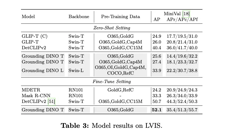 LVIS是一个用于长尾对象的数据集,它包含超过1000个类别用于评估。作者使用LVIS作为下游任务来测试他们的模型在零样本设置下的能力,并将GLIP作为基线。结果在表3中展示。Grounding DINO在相同设置下优于GLIP。