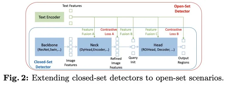 开放集目标检测(open-set object detection)的训练方法,其目的是利用语言泛化能力来检测任意类别。开放集目标检测与传统的封闭集目标检测不同,后者仅限于检测训练时见过的类别。在开放集目标检测中,模型需要能够识别和定位图像中未在训练数据中明确标注的物体类别。