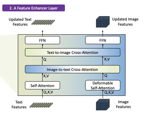 在这个阶段,设计了一个特征增强器(feature enhancer),它通过堆叠自注意力(self-attention)、从文本到图像的交叉注意力(text-to-image cross-attention)和从图像到文本的交叉注意力(image-to-text cross-attention)模块来增强特征表示。自注意力允许模型关注图像或文本内部的上下文信息,而交叉注意力则帮助模型理解两个模态之间的关联。