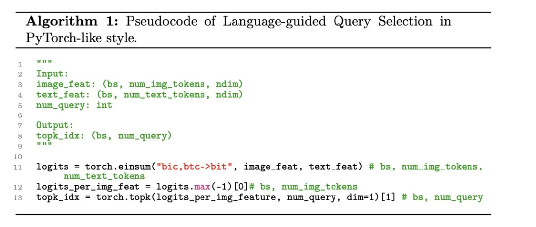 Grounding DINO的目标是从图像中检测出由输入文本指定的对象。为了有效地利用输入文本来指导对象检测,我们设计了一个语言引导的查询选择模块来选择与输入文本更相关的特征作为解码器的查询。我们用PyTorch风格的伪代码在Algorithm 1中展示了查询选择过程。