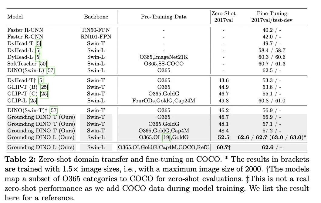 在COCO minival评估中,Grounding DINO取得了62.6个AP,超过了DINO的62.5个AP。