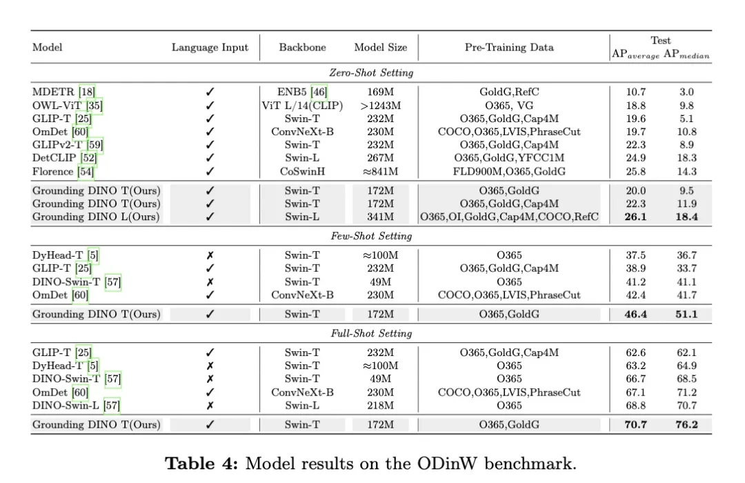ODinW(Object Detection in the Wild)是一个更具挑战性的基准测试,用于评估模型在真实世界场景下的性能。它收集了超过35个数据集进行评估。在表4中,作者报告了零样本、少量样本和全样本三种设置的结果。在这个基准测试中,Grounding DINO表现良好。仅使用O365和GoldG进行预训练的Grounding-DINO-T在少量样本和全样本设置上都优于DINO。