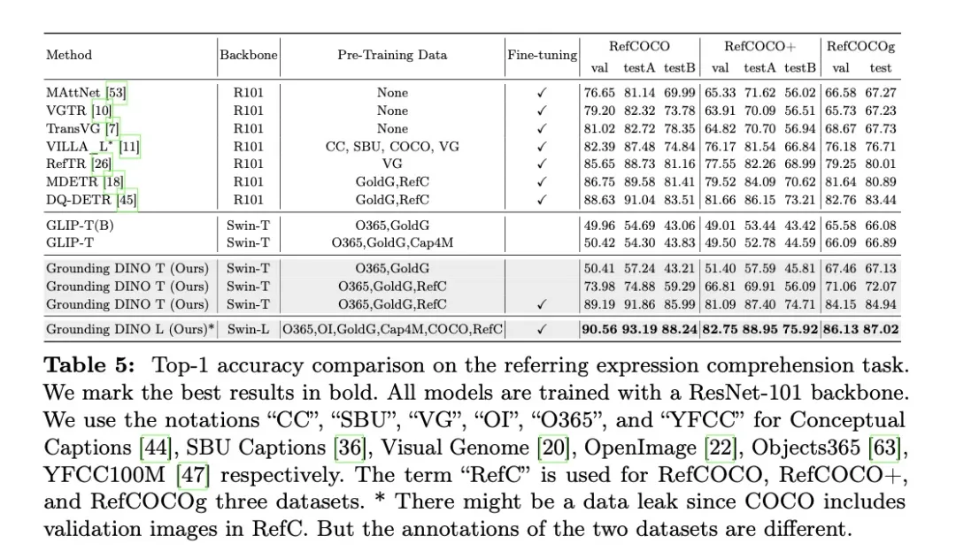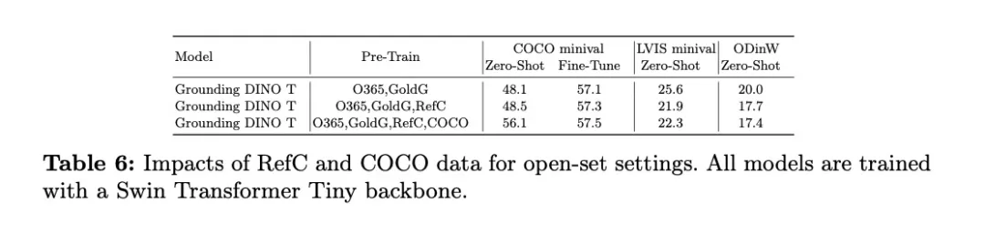 表5中展示了模型在RefCOCO/+/g数据集上的性能结果。结果显示,Grounding DINO在相同的设置下表现优于GLIP。然而,无论是GLIP还是Grounding DINO,在没有REC数据(指Referential Expression Comprehension,参考表达理解数据)的情况下性能都不好。作者观察到,更多的训练数据(如标题数据)或更大的模型对最终性能有一些帮助,但影响并不显著。然而,在训练中注入RefCOCO/+/g数据之后,Grounding DINO获得了显著的提升。在RefCOCO/+/g数据集上,Grounding DINO 的性能优于GLIP,而且在加入了REC数据后,性能得到了显著提升。这些观察结果对于指导未来的模型设计和训练策略具有重要意义。