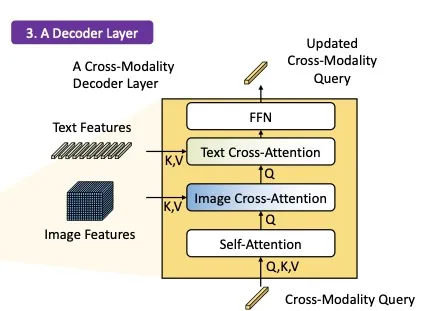 我们开发了一个跨模态解码器来结合图像和文本模态特征,如图3方块3所示。在每个跨模态解码器层中,每个跨模态查询都被送入一个自关注层、一个图像交叉关注层以结合图像特征、一个文本交叉关注层以结合文本特征,以及一个FFN层。与DINO解码层相比,每个解码层都有一个额外的文本交叉注意层,因为我们需要将文本信息注入查询,以便更好地进行模态对齐。