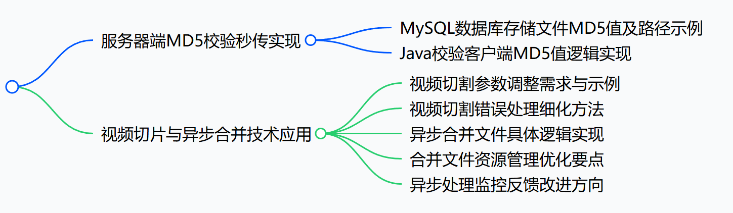 本文介绍两种网络技术实现方法。一是 MD5 校验秒传,服务器端用数据库记上传文件 MD5 值及存储路径,Java 代码接收客户端 MD5 值并查询校验,返回状态码。二是用 ffmpeg 切片视频成 m3u8 上传,异步合并文件实现视频按需加载。