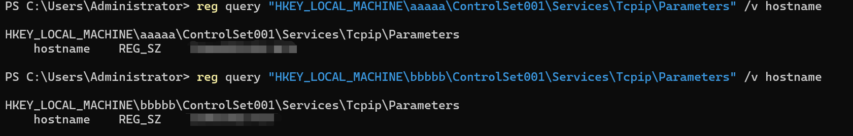 reg query "HKEY_LOCAL_MACHINE\aaaaa\ControlSet001\Services\Tcpip\Parameters" /v hostname