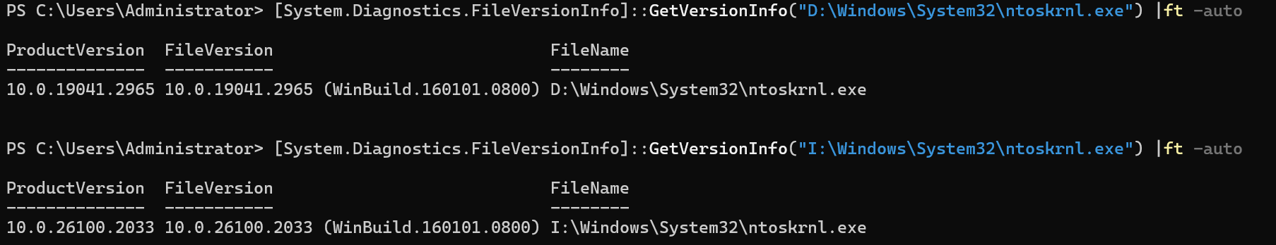 [System.Diagnostics.FileVersionInfo]::GetVersionInfo("I:\Windows\System32\ntoskrnl.exe") |ft -auto