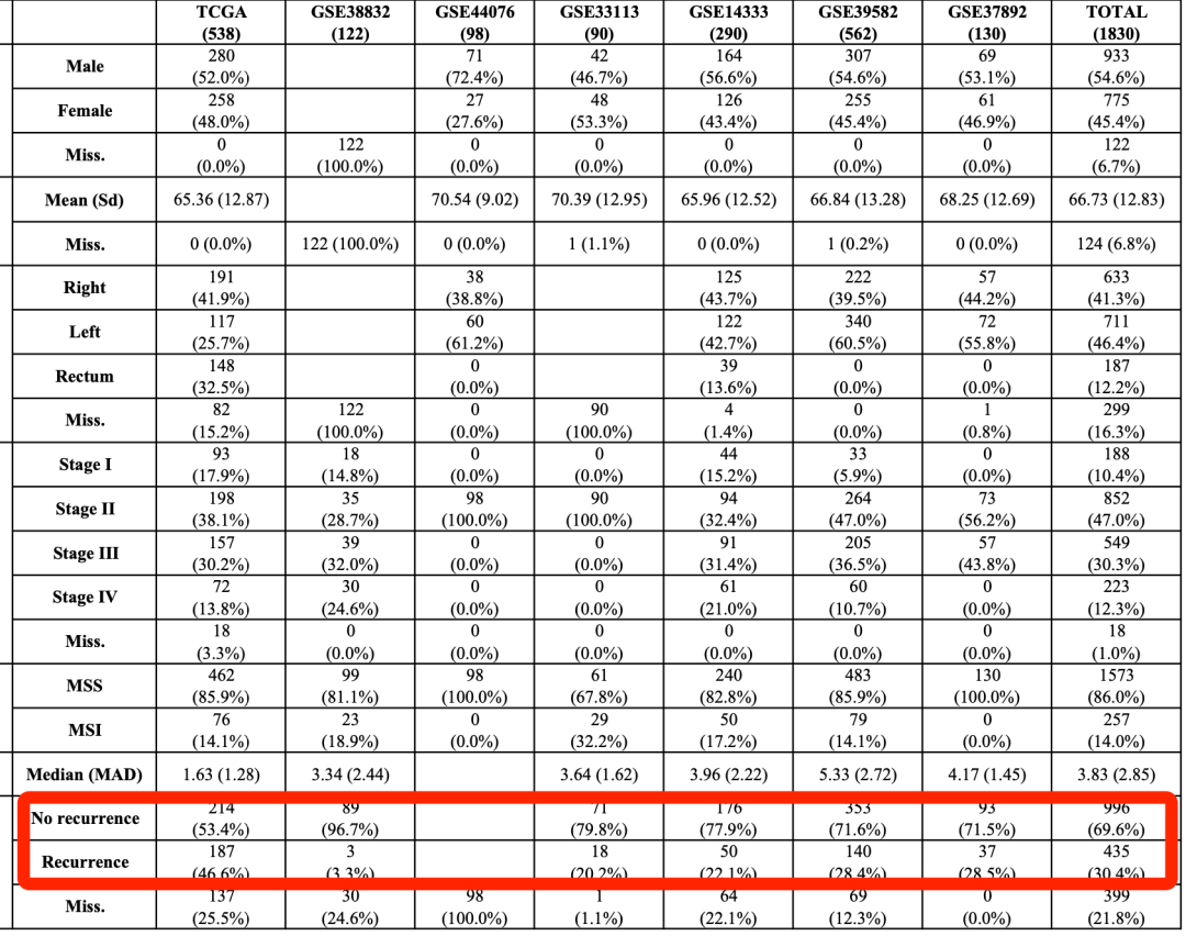 学员在微信群问到一个geo数据库里面的数据集的临床信息不清晰,导致没办法做生存分析。但是学员确实是在公共数据集里面看到很文献使用了它也成功的做了生存分析,比如这个2022的nature文章:《Metastatic recurrence in colorectal cancer arises from residual EMP1+ cells》,就是汇总了多个数据集的生存信息 :