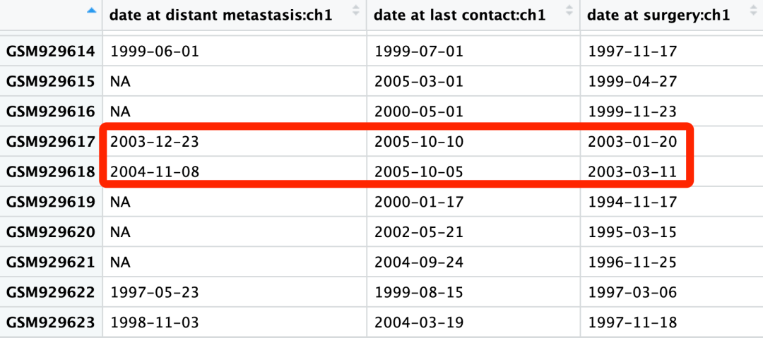 "date at last contact:ch1" , "date at surgery:ch1" 该如何理解呢,分别是 2004-11-03