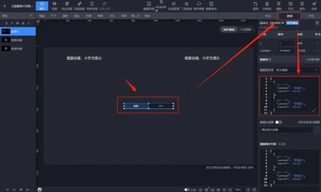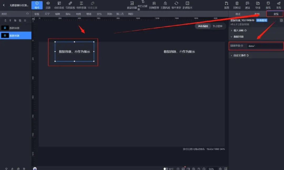 【交互】→左侧【数据容器】回调字段设置为data1→右侧【数据容器】回调字段设置为data2。