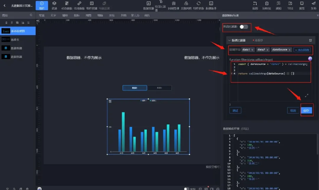 设置过滤器代码如下→设置回调字段【data1】【data2】【dataSource】→【保存】→【开启过滤器】。