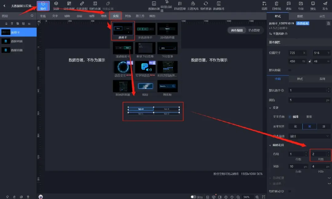 【组件】→【交互】→添加【选项卡】组件→选中【选项卡】→【样式】→【全局】→布局调整列数为【2】。