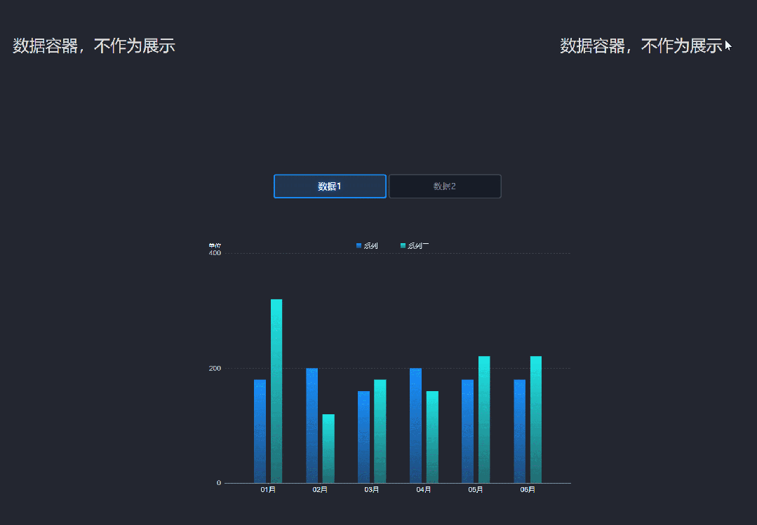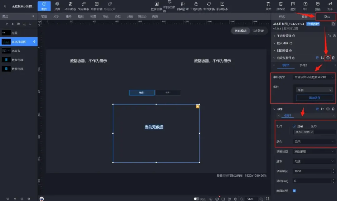 通过设置两个【数据容器】,一个存有数据,一个无数据。在数据展示【图表】上配置【自定义事件】,通过条件判断执行不同的动作,实现有数据时显示数据展示【图表】,无数据时显示无数据【文本】。