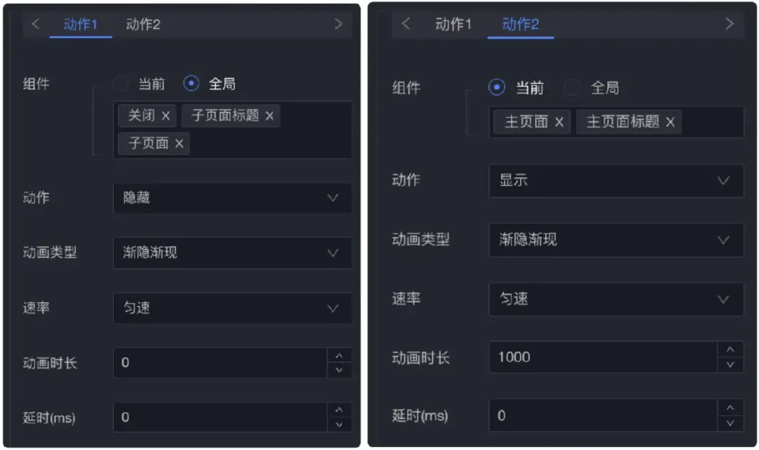 动作1:配置点击关闭按钮【隐藏子页面】的动作。选择组件【子页面标题】、【关闭】、【子页面】。动作为【隐藏】,动画时长根据喜好选择。
