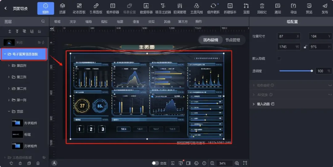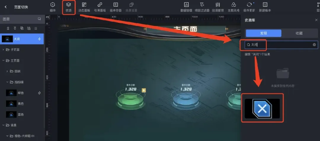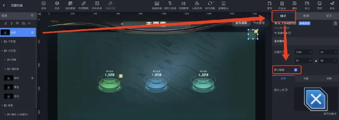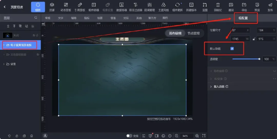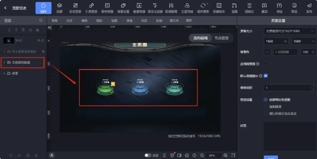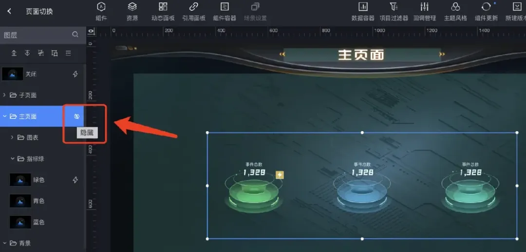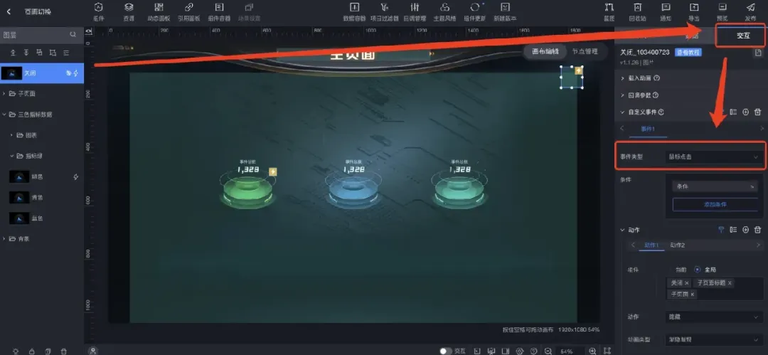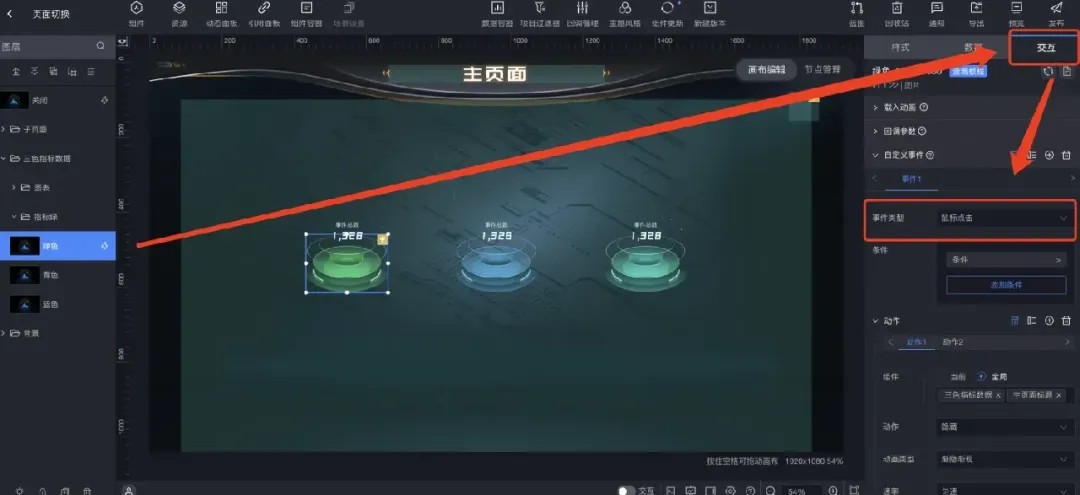 选择组件【三色指标数据】(主页面)、【主页面标题】。动作为【显示】,动画时长根据喜好选择。