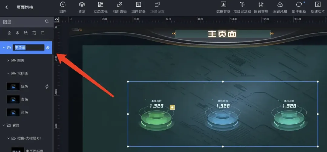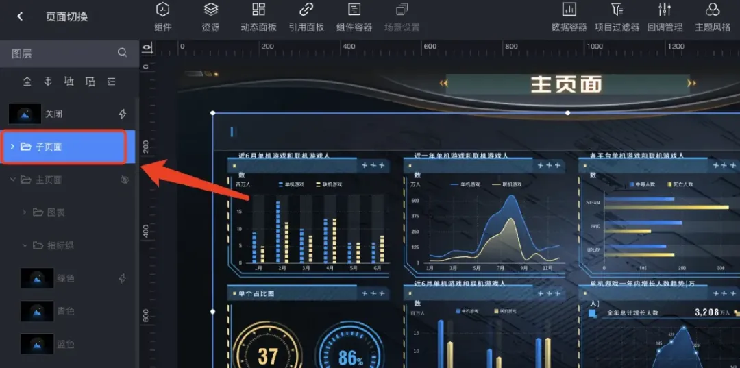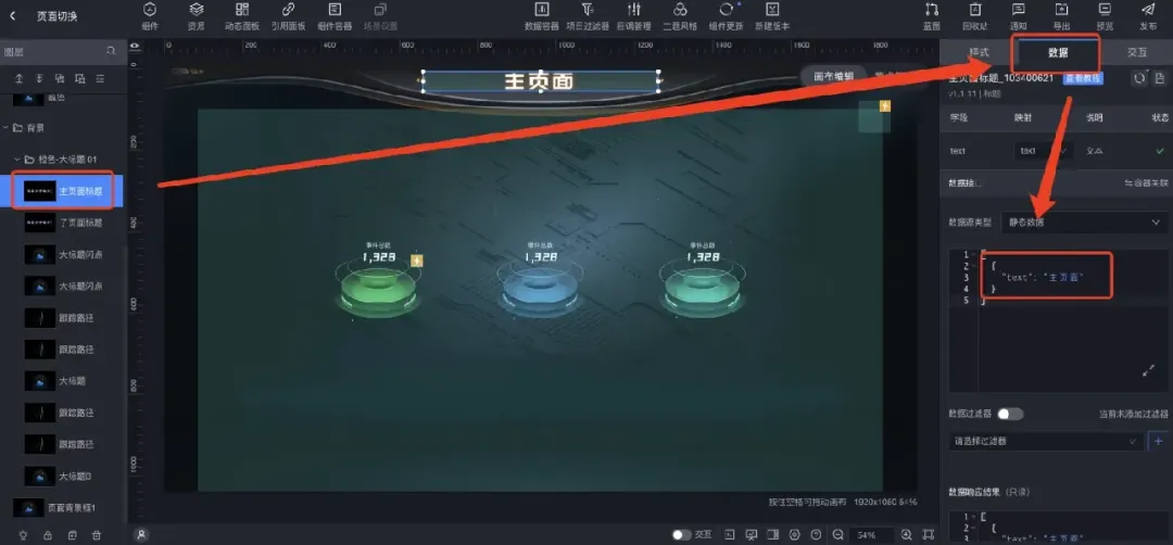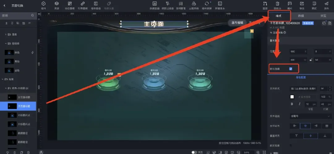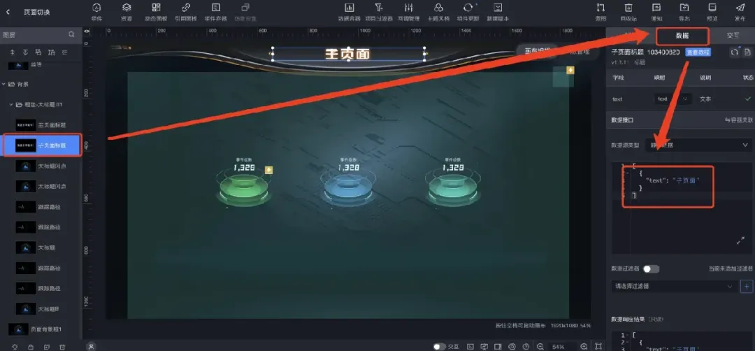 分别在右侧数据栏中设置两个标题组件为“主页面”与“子页面”。(记得及时对左侧的组件进行重命名,方便后续区分)