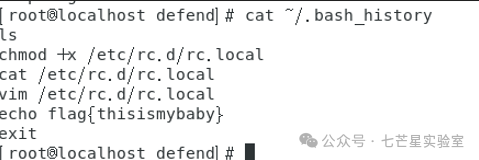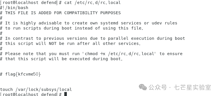从上面可以看到这里对/etc/rc.d/rc.local进行了更改,随后查看该文件,获取到第二个flag——flag{kfcvme50}
