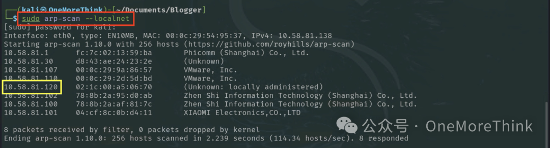 靶机启动后,没有提供IP地址。由于Kali和靶机在同一个C段,可以扫描ARP协议获取靶机IP地址。