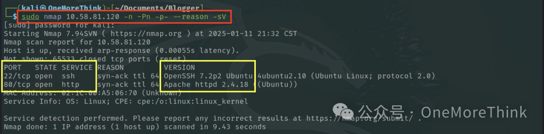 对靶机进行全端口扫描、服务扫描、版本扫描,发现22/SSH、80/HTTP。