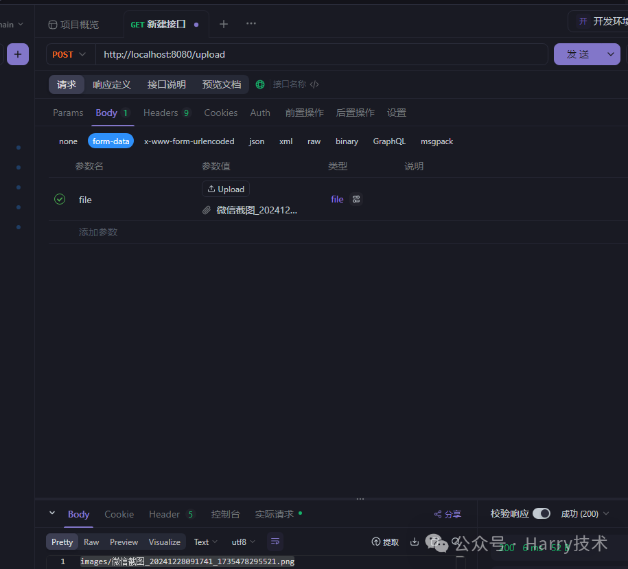 编写前端进行测试,这里采用Apifox模拟图片上传,并在浏览器中访问打开