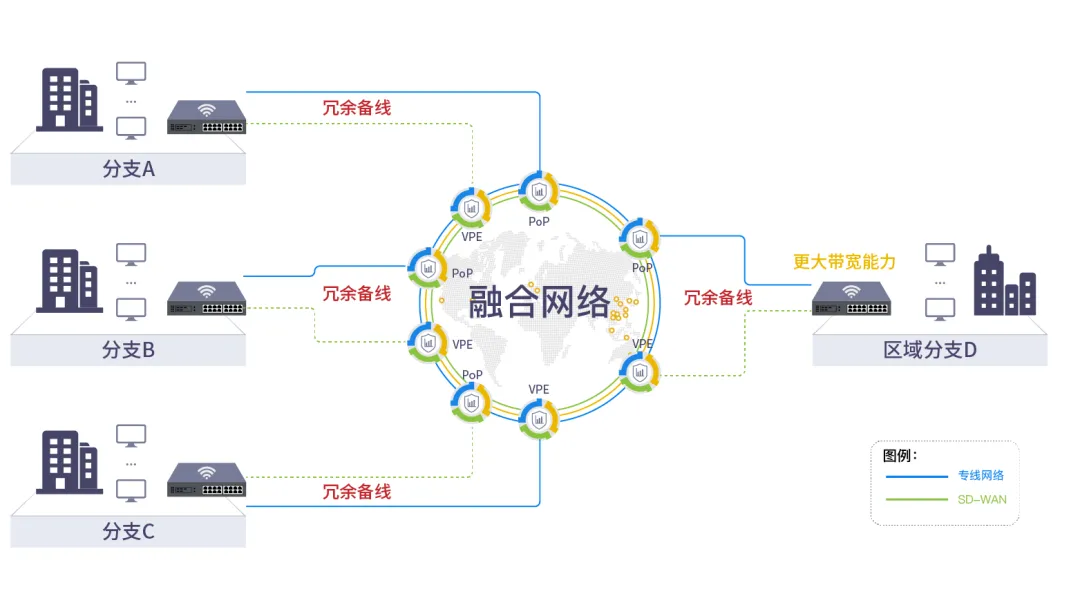 通过专线为主线,SD-WAN备线模式,实现全国各研发办公室的高速互联,并优化跨地域的数据传输。