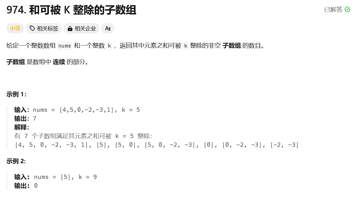 };题目链接:和可被 K 整除的子数组 题目描述: