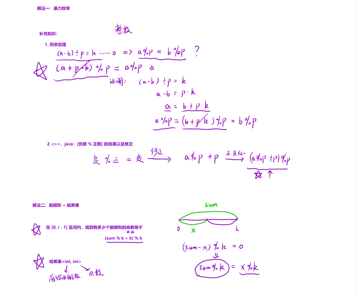 sum: 当前的前缀和。hash: 一个哈希表,记录前缀和的余数出现的次数。 hash[0] = 1: 初始设置表示前缀和本身就是 的情况。