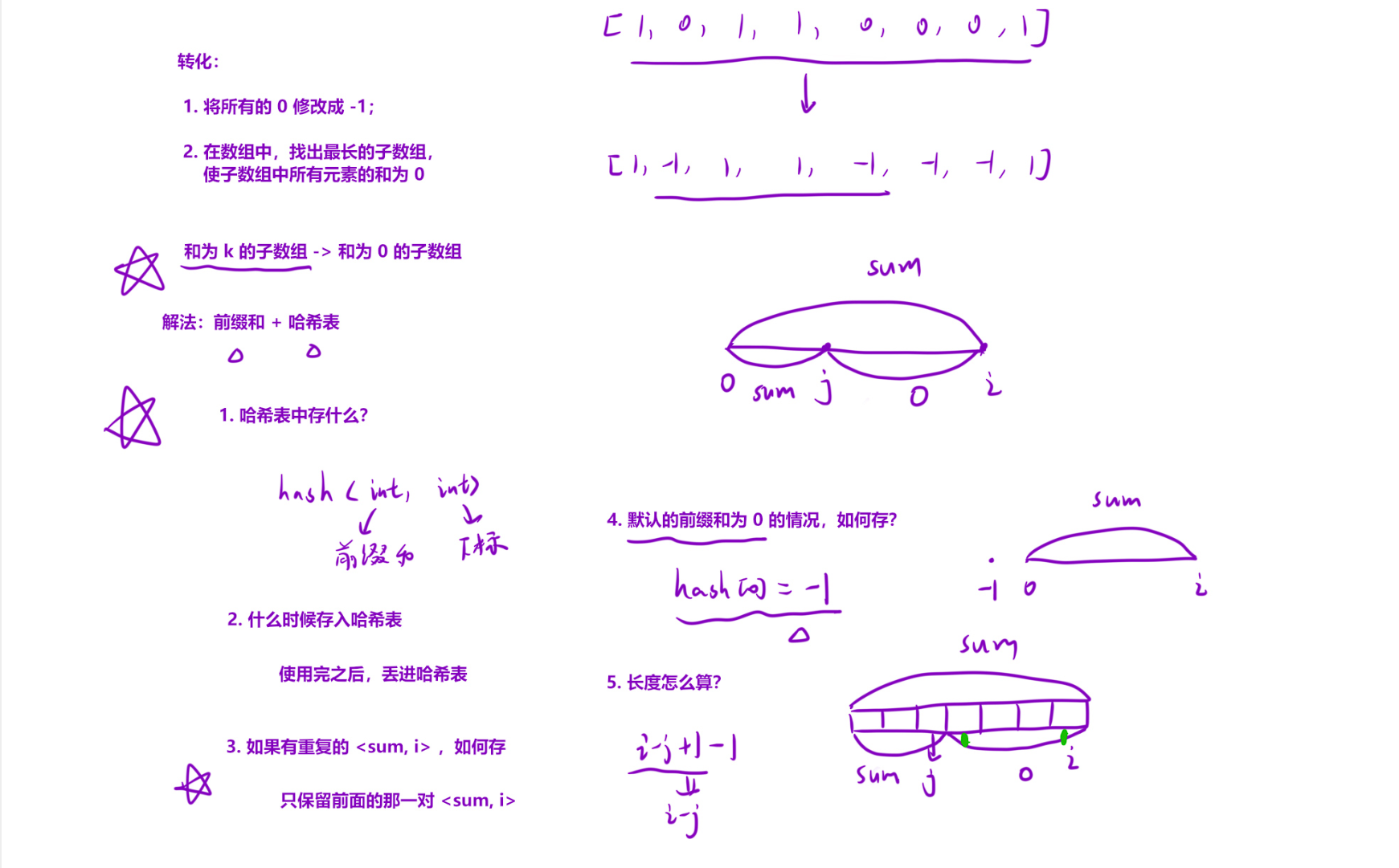 hash[0] = -1; // 初始化:前缀和为 0 时的位置是 -1