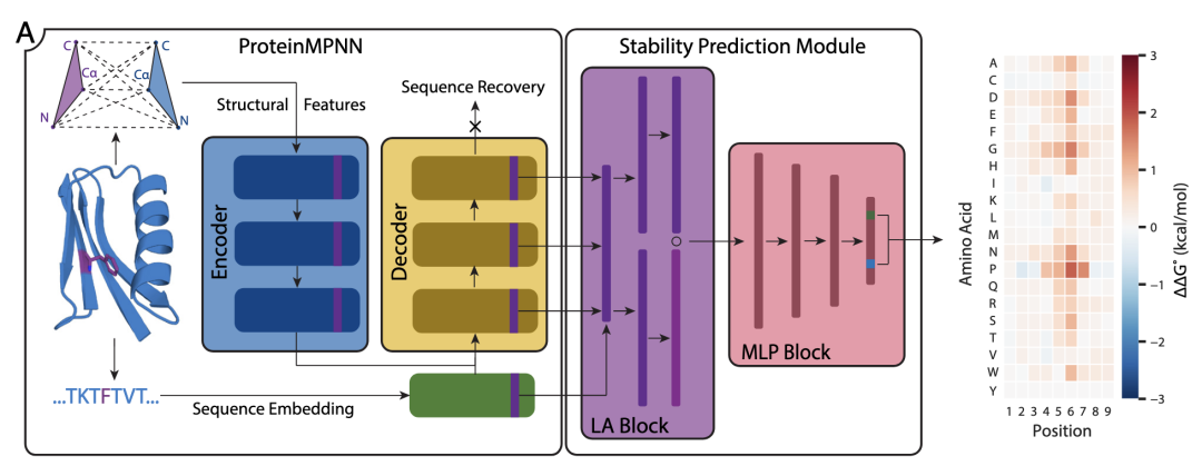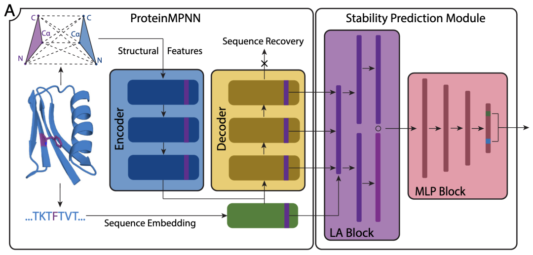 模型的输入:野生型的蛋白质结构以及野生型的蛋白质序列。突变信息并未直接作为输入。在ProteinMPNN模块中,Encoder结合蛋白质的结构和序列信息,Encoder的输出不会直接被使用,而是作为Decoder的输入;Decoder有3层,图中每个Decoder层的右侧都有一个紫色条,这代表突变位置的氨基酸embedding。将三层decoder突变位置氨基酸的embedding和序列嵌入中突变位置氨基酸的embedding拼接起来,生成Stability Prediction Module的输入向量。