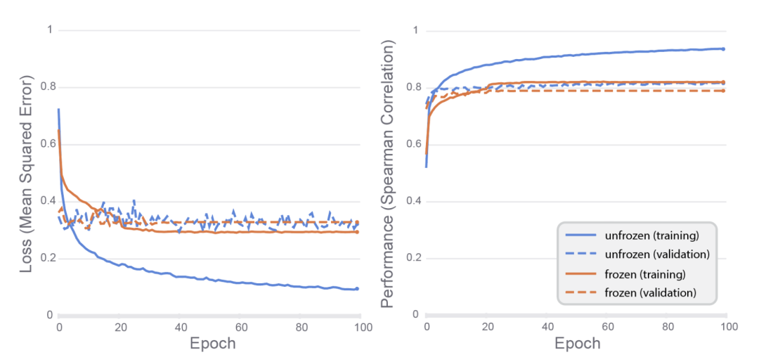 通过迁移学习的ThermoMPNN模型显著提升了性能。重要的是,从经过序列恢复训练优化的ProteinMPNN权重开始迁移学习至关重要,直接从随机权重训练会导致显著性能下降。然而,对预训练权重进行微调(fine-tuning)效果不一,尽管在Megascale数据集上略有提升,但在Fireprot数据集上的表现与迁移学习相近并且伴随明显的过拟合现象,见下图。