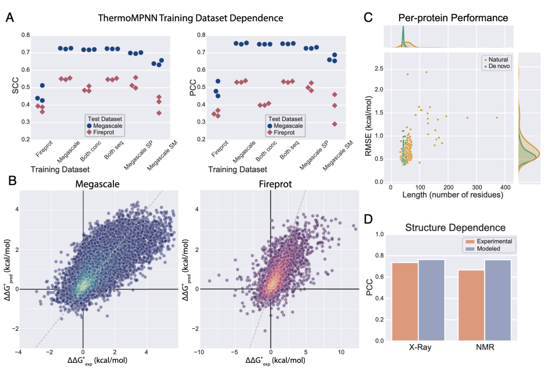 图中展示了ThermoMPNN模型的性能分析,主要从训练数据集依赖性、预测与实验数据的相关性、每个蛋白的表现以及结构依赖性四个方面进行了评估。结果表明,不同的训练数据集对模型的预测性能有显著影响,联合使用Megascale和Fireprot数据进行训练可以提升在两个测试集上的表现。预测的ΔΔG与实验值之间在两个测试集上都呈现较高的相关性(SCC和PCC)。模型的每蛋白预测误差(RMSE)随蛋白长度变化,天然蛋白与新设计蛋白的误差分布有所不同。此外,模型在基于X射线结构和NMR结构的蛋白预测中均表现出较高的相关性,表明其性能在不同结构数据上具有鲁棒性。