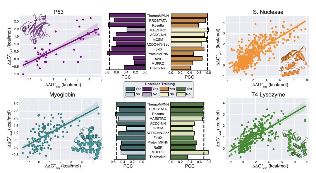图中对ThermoMPNN在几个典型蛋白(P53、S. Nuclease、Myoglobin、T4 Lysozyme)上的预测性能与其他文献方法进行了对比。左侧和右侧分别展示了ThermoMPNN预测的ΔΔGpred与实验值ΔΔGexp的散点图及线性回归结果,显示出较高的相关性(PCC),表明模型在这些蛋白上的预测能力较强。中间柱状图总结了不同方法的PCC值,区分了是否进行无同源蛋白的“无偏训练”(Unbiased Training)。结果显示,ThermoMPNN的PCC值在多种蛋白上表现优异,优于大多数传统方法(如Rosetta和FoldX)。同时,还特别强调了数据泄露问题的控制(用浅色柱表示),进一步验证了ThermoMPNN的可靠性和普适性。这些结果说明ThermoMPNN在蛋白稳定性预测领域具有显著优势。