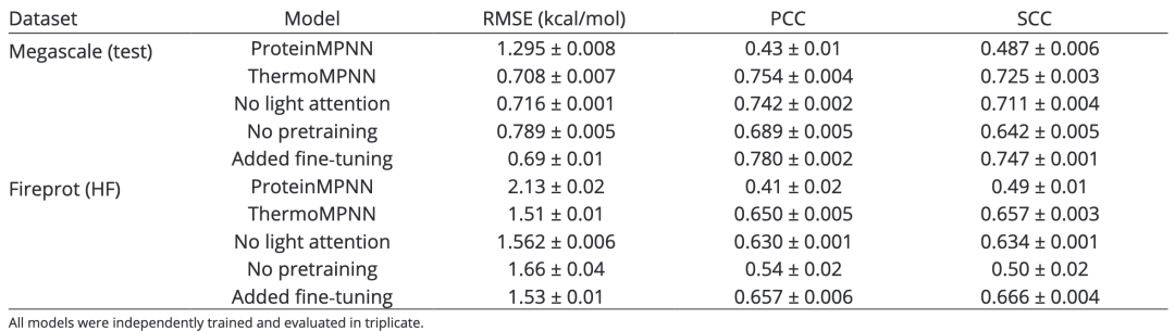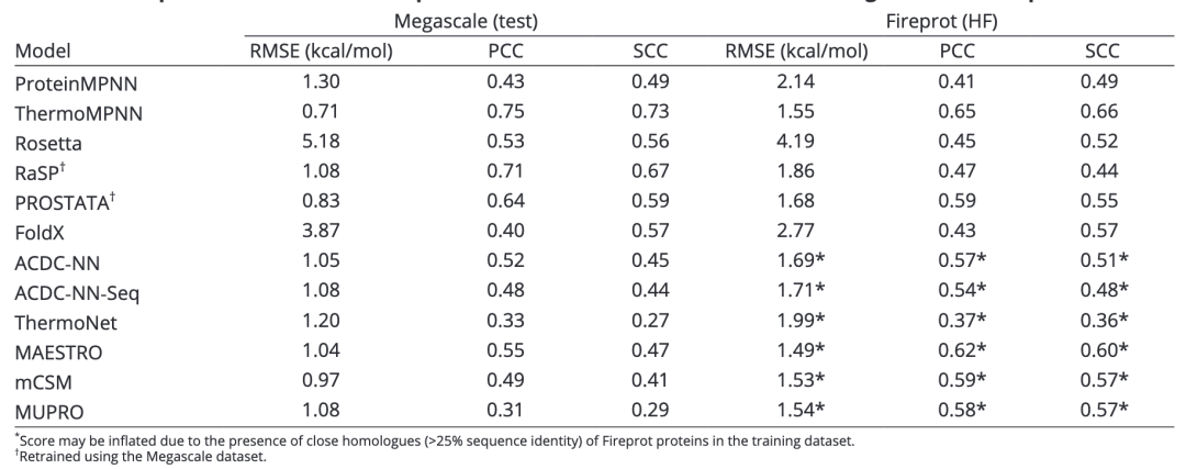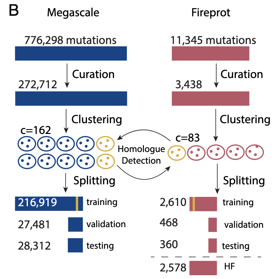 为了评估模型在传统生物物理技术和实验解析结构上的热力学稳定性数据表现,从FireProtDB数据库匹配到PDB的实验结构,构建了一个额外数据集。经过去重、清理缺失信息并选择最接近生物pH的测量值后,最终得到包含3,438个突变、覆盖100个独特蛋白质 的Fireprot数据集,其规模与常见的文献训练集相当(如S2648、Q3421、Q3488),且具有显著的蛋白同源性重叠。随后,使用MMseqs2对Megascale和Fireprot数据集进行聚类,采用严格的序列同一性阈值(25%),并通过交叉引用检测同源性重叠。任何具有同源性的蛋白簇都被分配至相应的训练集,以确保测试集中蛋白与训练集无同源关系。剩余的突变数据按80/10/10随机划分为训练、验证和测试集。此外,对于Fireprot数据集,包含>250数据点的蛋白被直接分配至训练集,以避免其在验证或测试集中造成结果偏差。最后,构建了一个Fireprot “同源去除” (HF) 数据集,用于评估仅在Megascale数据集上训练的模型,其排除了所有与 Megascale 蛋白同源的Fireprot数据点。