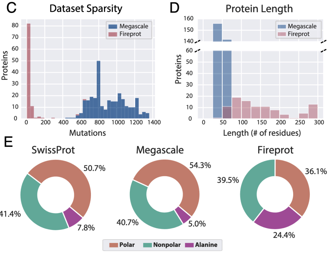 本研究使用的Megascale数据集 来自Tsuboyama等人的研究[2],通过蛋白酶敏感性实验推导出ΔΔG°值,覆盖 776,000个数据点,远超以往低通量生物物理实验的数据规模。为了提高数据可靠性,对原始数据进行了清洗:首先,去除了因表达不足、测量值超出动态范围或两种蛋白酶间相关性较差而被标记为“不可靠”的数据点,保留607,839个可靠突变;其次,去除了插入、删除和双点突变,保留391,090个单点突变;最后,排除了使用修改过的野生型背景蛋白质的突变(约占12%),以避免由计算预测结构引入的不准确性或非局部构象变化的影响。最终数据集包含272,712个突变,覆盖298个蛋白质。