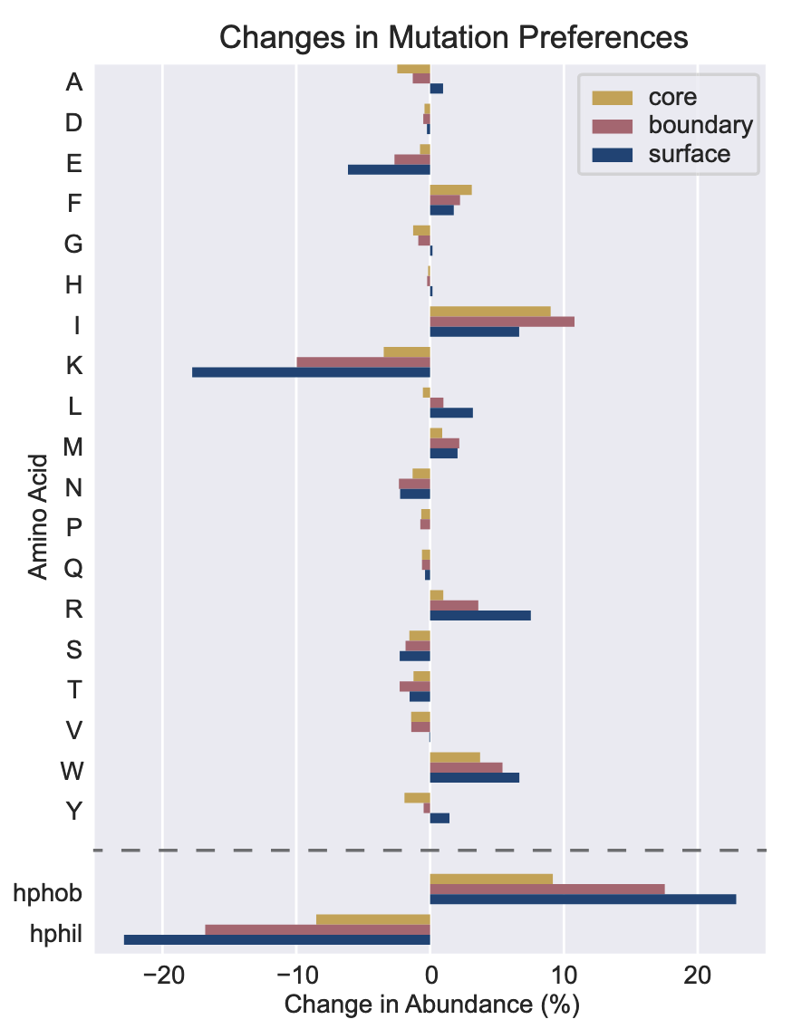 下图比较了ThermoMPNN与ProteinMPNN对不同氨基酸突变偏好的变化。在所有Megascale和Fireprot蛋白的每个位点选择最优突变时,ThermoMPNN表现出与ProteinMPNN不同的氨基酸偏好模式。图中以核心(core)、边界(boundary)和表面(surface)三种蛋白区域分别展示了氨基酸丰度的变化百分比,发现某些氨基酸(如K、L、N等)在不同区域的偏好变化显著。疏水性和亲水性突变的整体趋势也有所差异,表明ThermoMPNN对蛋白不同结构区域的突变设计具有更精细的调控能力。值得注意的是,半胱氨酸突变因可能形成二硫键被排除在分析之外。