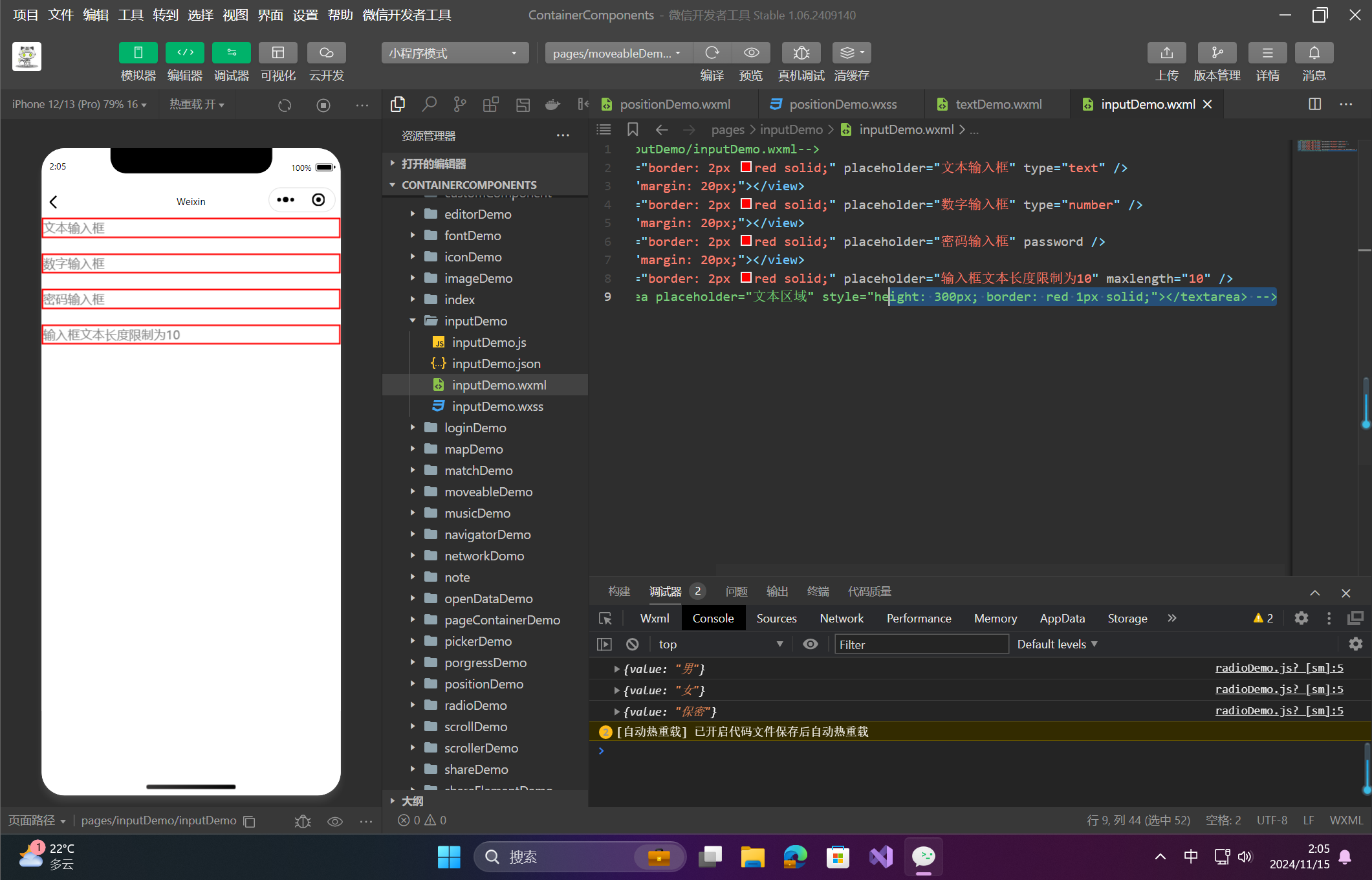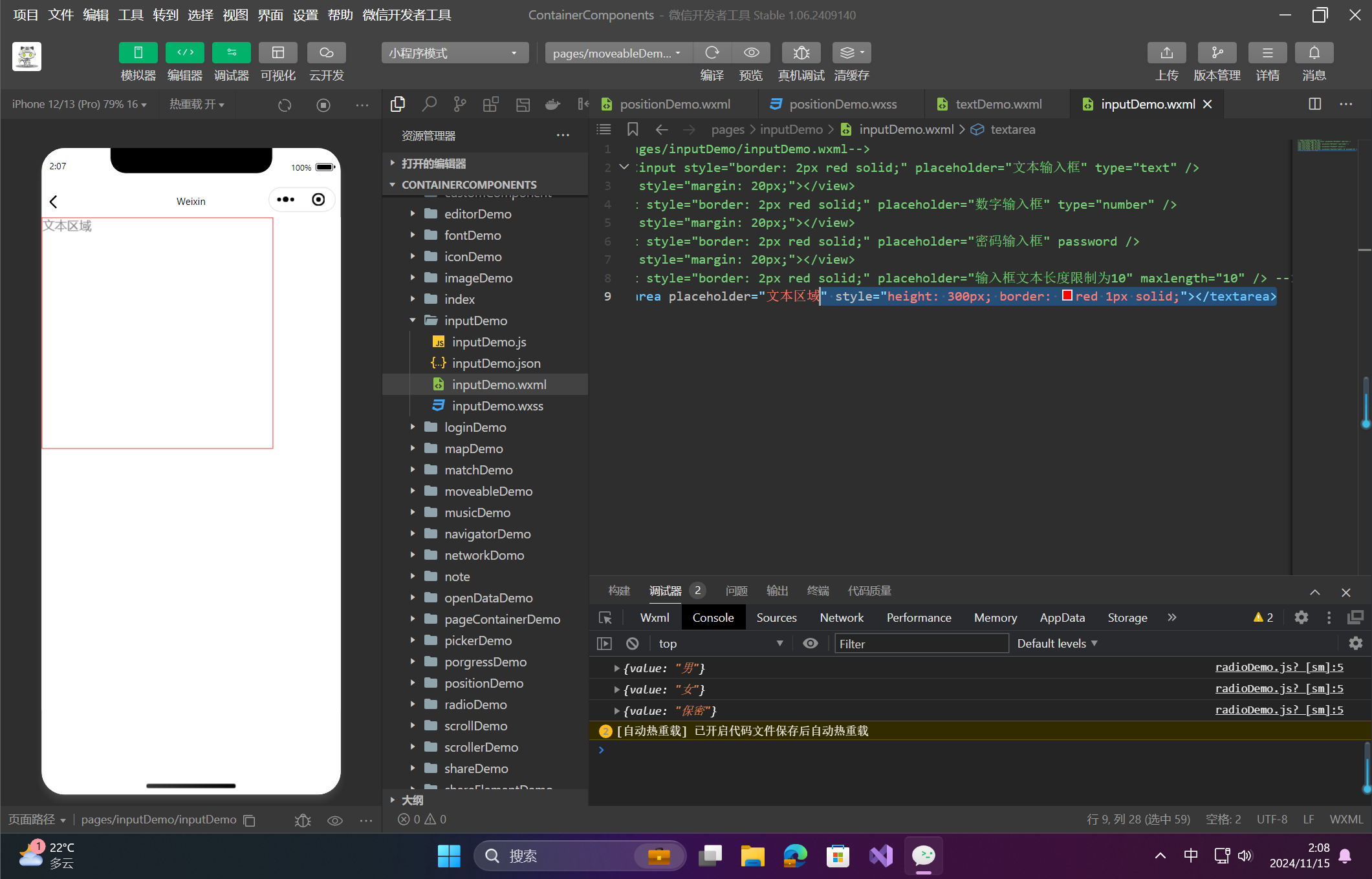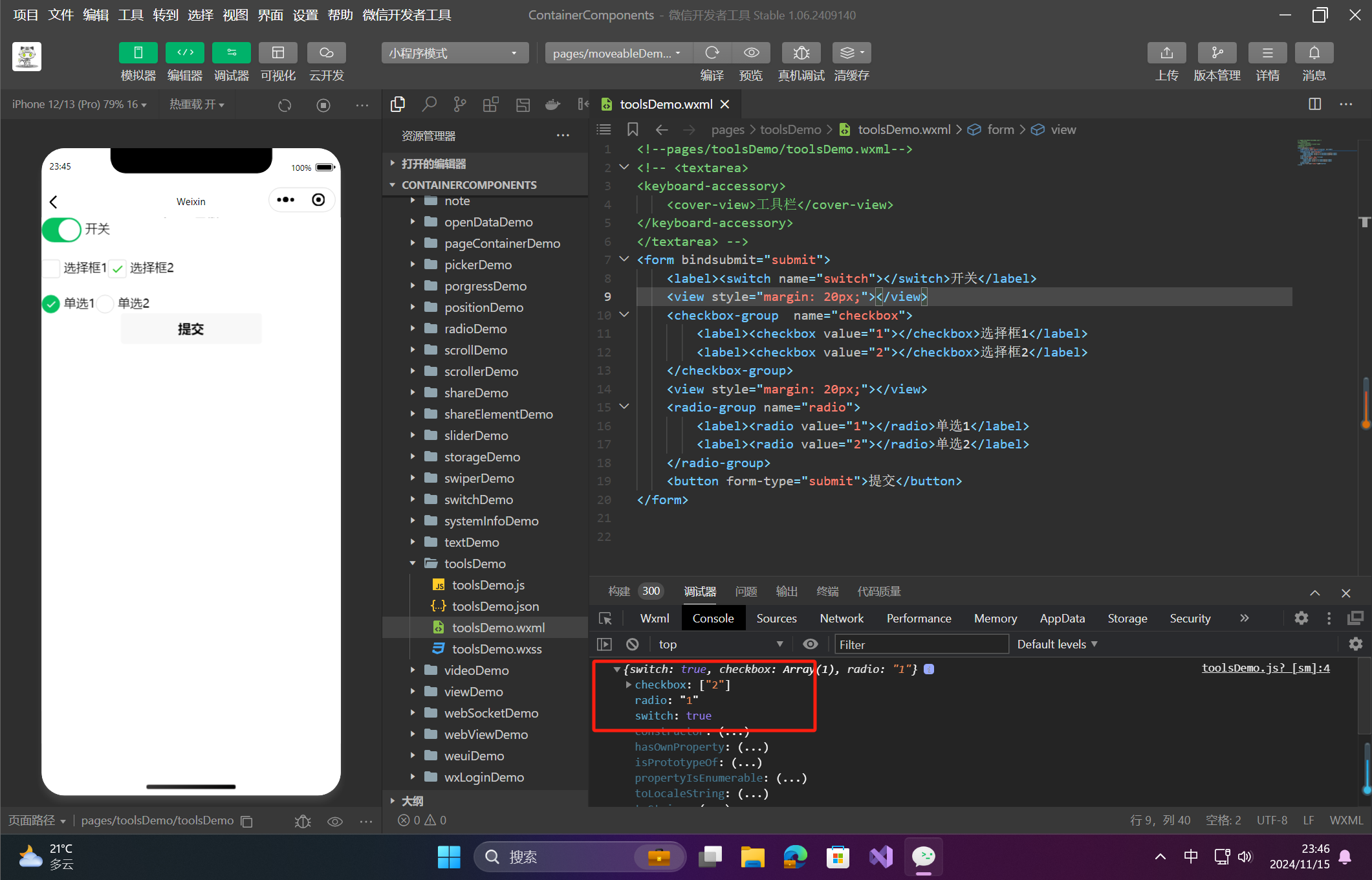 });运行代码,改变一下页面中各个按钮和选择框的状态,点击提交按钮后,观察控制台的输出,可以看到 form 组件已经将要提交的数据进行了聚合,使用非常方便。