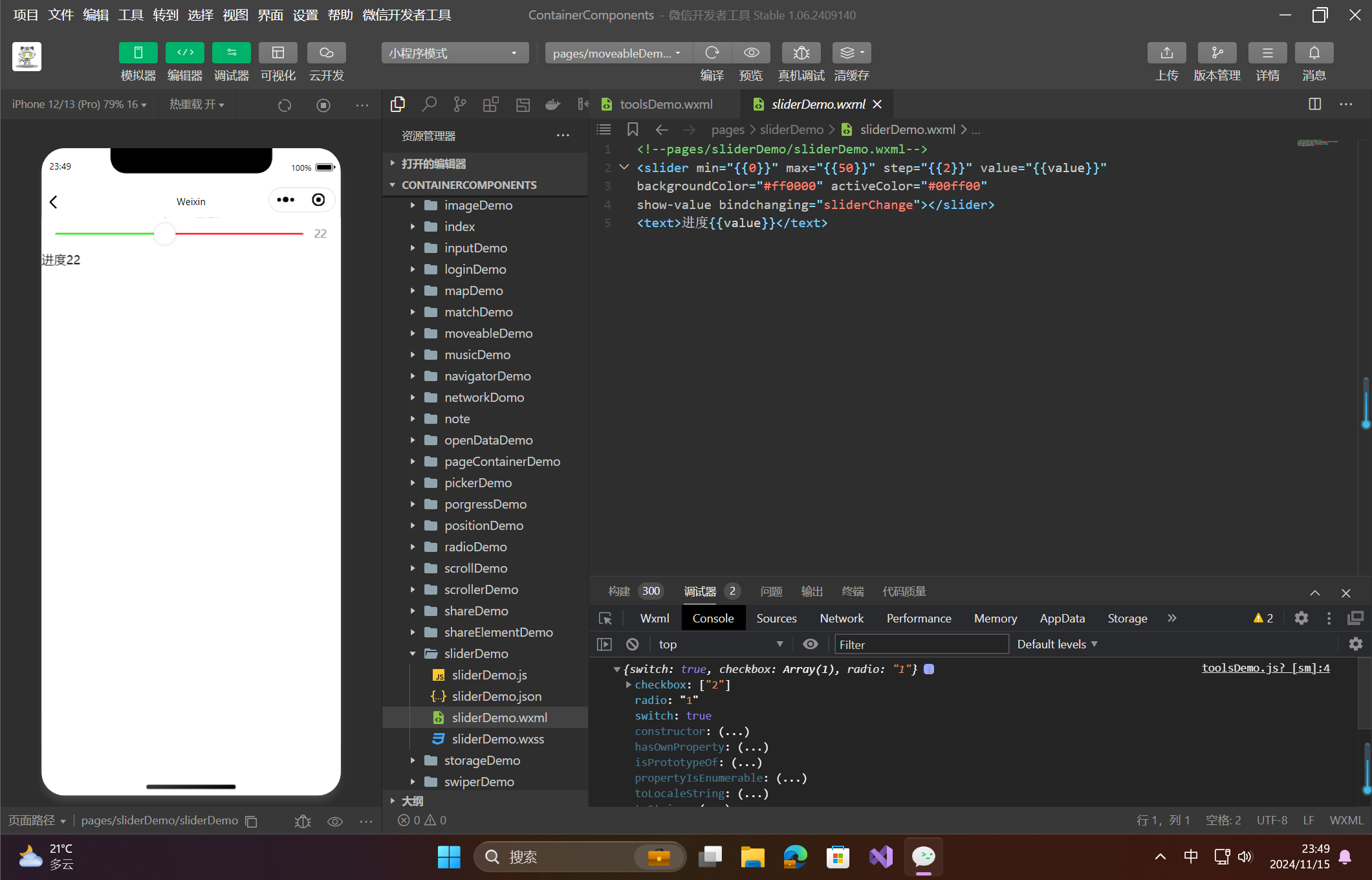 slider 组件提供了一种范围内数据取值的方式,常用在音量调节、亮度调节等场景中。在示例工程的 pages 文件夹下新建一组名为 sliderDemo 的页面文件,在 sliderDemo.wxml 文件中编写如下代码: