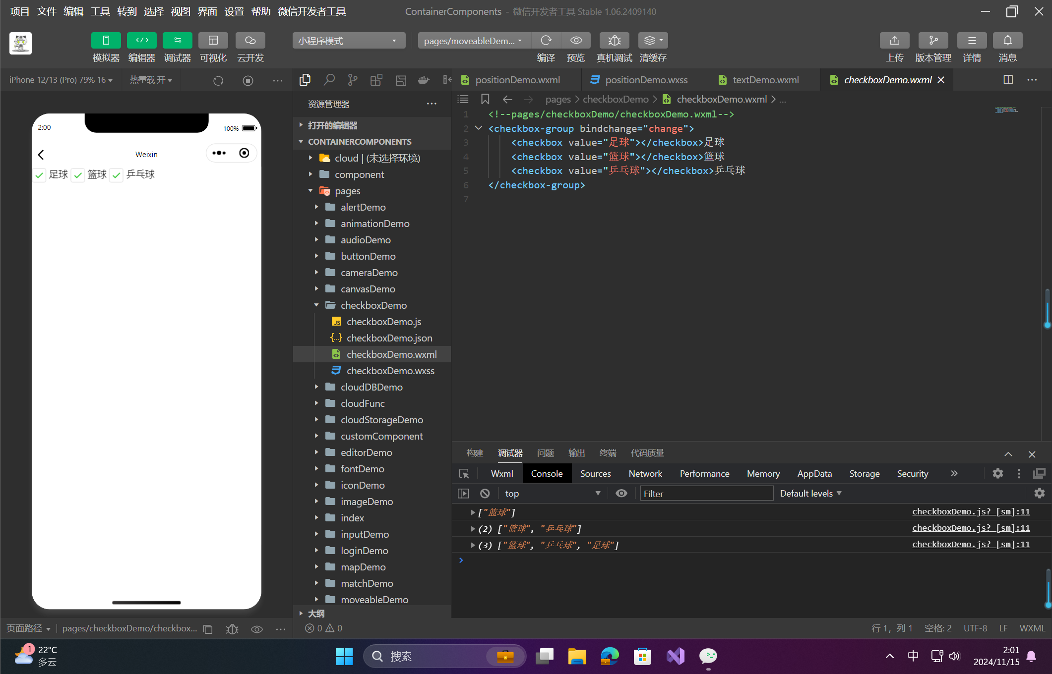 </checkbox-group>在 checkboxDemo.js 文件中实现绑定的回调事件函数: