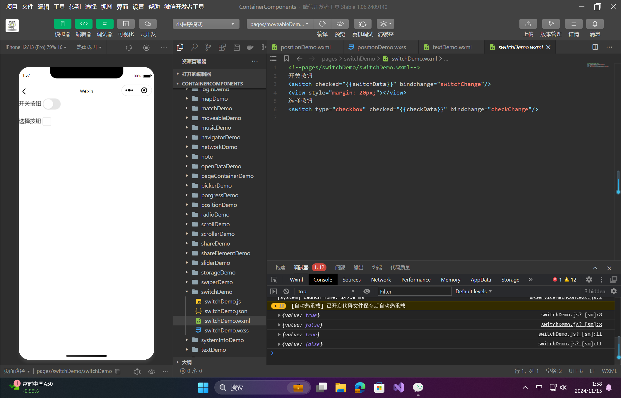switch 组件是一类特殊的按钮,它有开启和关闭两种状态。在很多应用的设置页面,都有类似的开关,比如控制是否有消息提示音,是否接收推送消息等。在 pages 文件夹下新建一组名为 switchDemo 的页面文件,在 switchDemo.wxml 文件中编写如下代码: