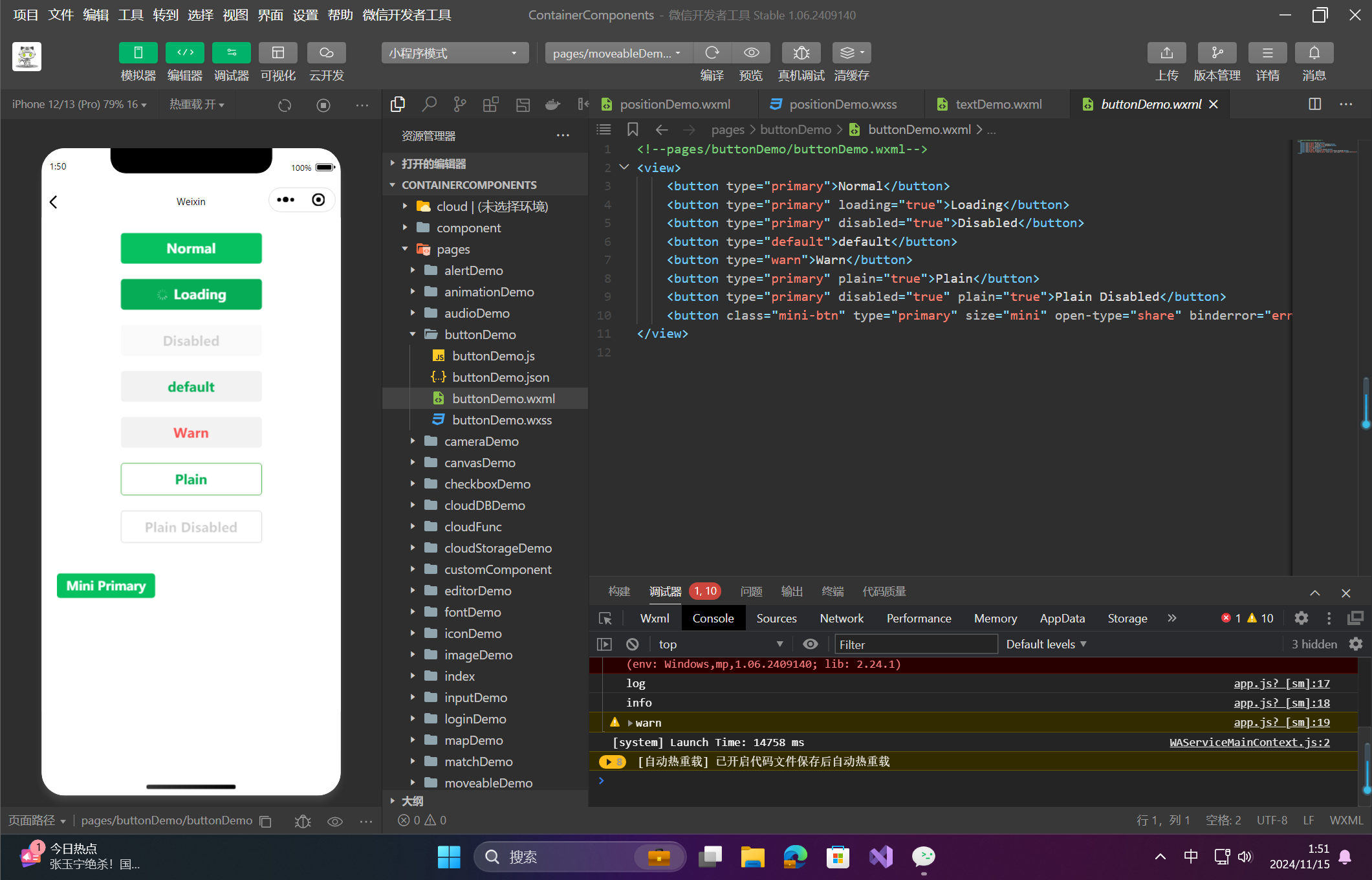 buttonDemo 页面中使用按钮组件buttonDemo.wxml 文件中编写如下代码:<!-- pages/buttonDemo/buttonDemo.wxml -->
