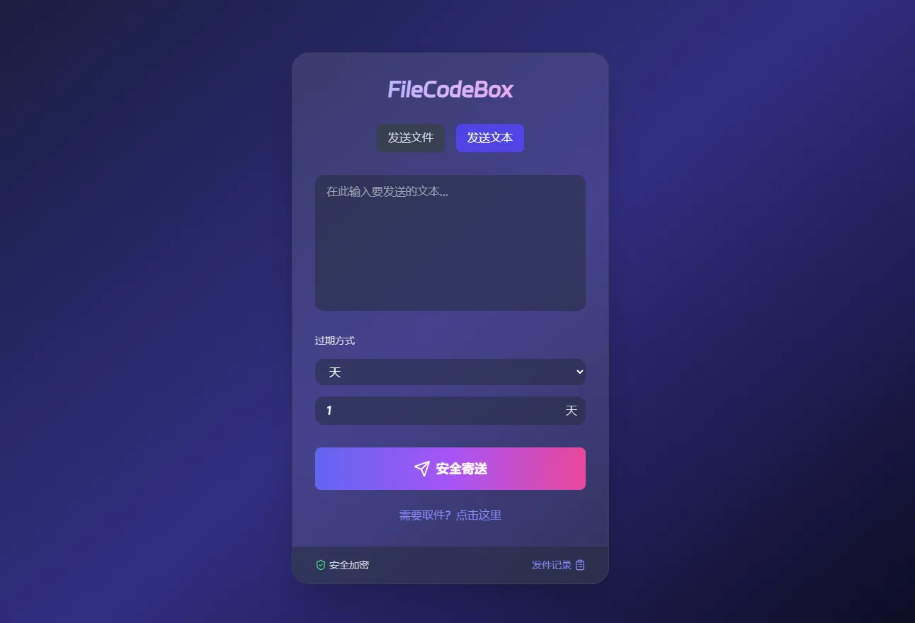 docker run -d --restart=always -p 12345:12345 -v /opt/FileCodeBox/:/app/data --name filecodebox dc.065065.xyz/lanol/filecodebox:betaFileCodeBox 的设计理念是让文件分享变得更加便捷和安全。通过匿名口令分享,用户可以在不暴露个人信息的情况下,轻松分享文本和文件。系统的轻量简洁设计,使得用户在使用过程中体验更加流畅。防止爆破和滥用的功能,确保了系统的安全性和稳定性。国际化支持,让全球用户都能方便地使用 FileCodeBox。