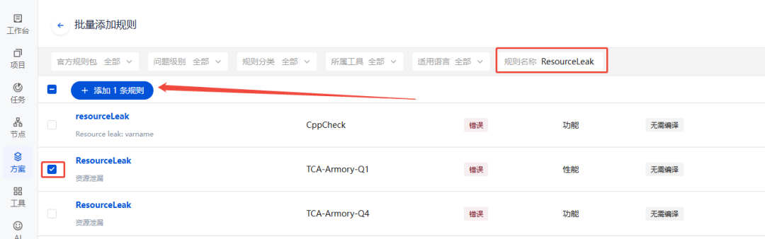 进入页面,点击方案->规则配置 -> 自定义规则包-> 添加规则 ->搜索规则名ResourceLeak->选择需要添加的规则 ->批量添加规则