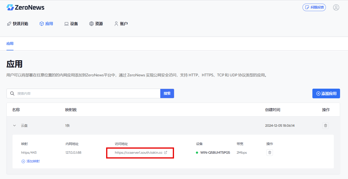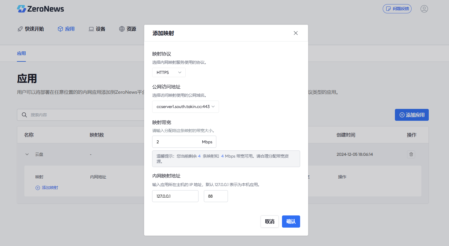 5、 然后在应用里创建映射服务,选择https协议,以及刚创建好的域名,然后内网 IP 默认为127.0.0.0,端口根据刚才配置Serv-U http服务时对应的端口