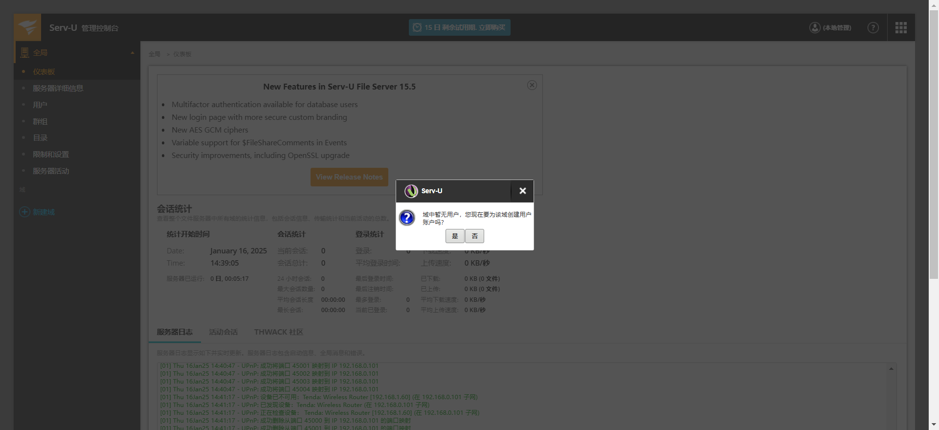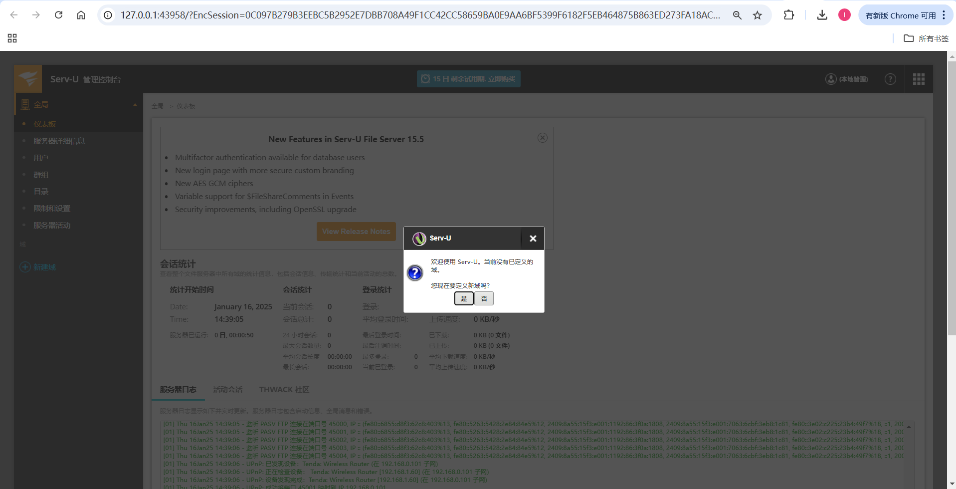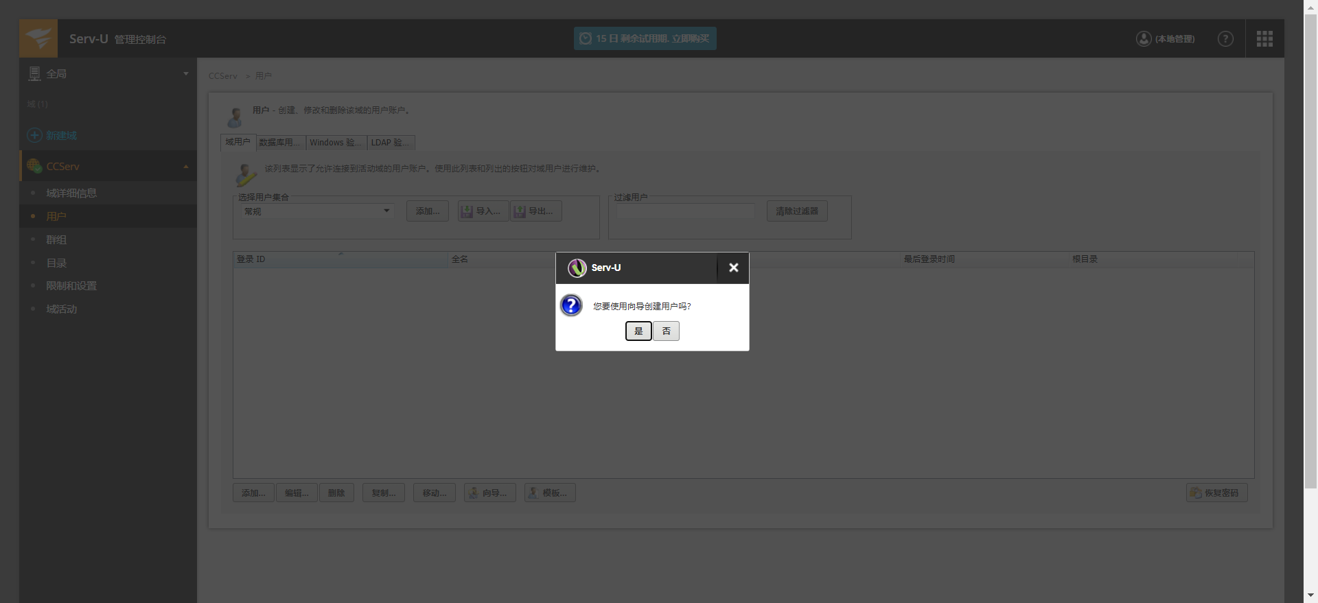 4、 然后会在默认浏览器打开 Serv-U 管理控制台,默认有一个弹窗,如果您非常熟悉,可以直接跳过,然后按照自己的需求填写,如果您比较陌生,则点击“是”
