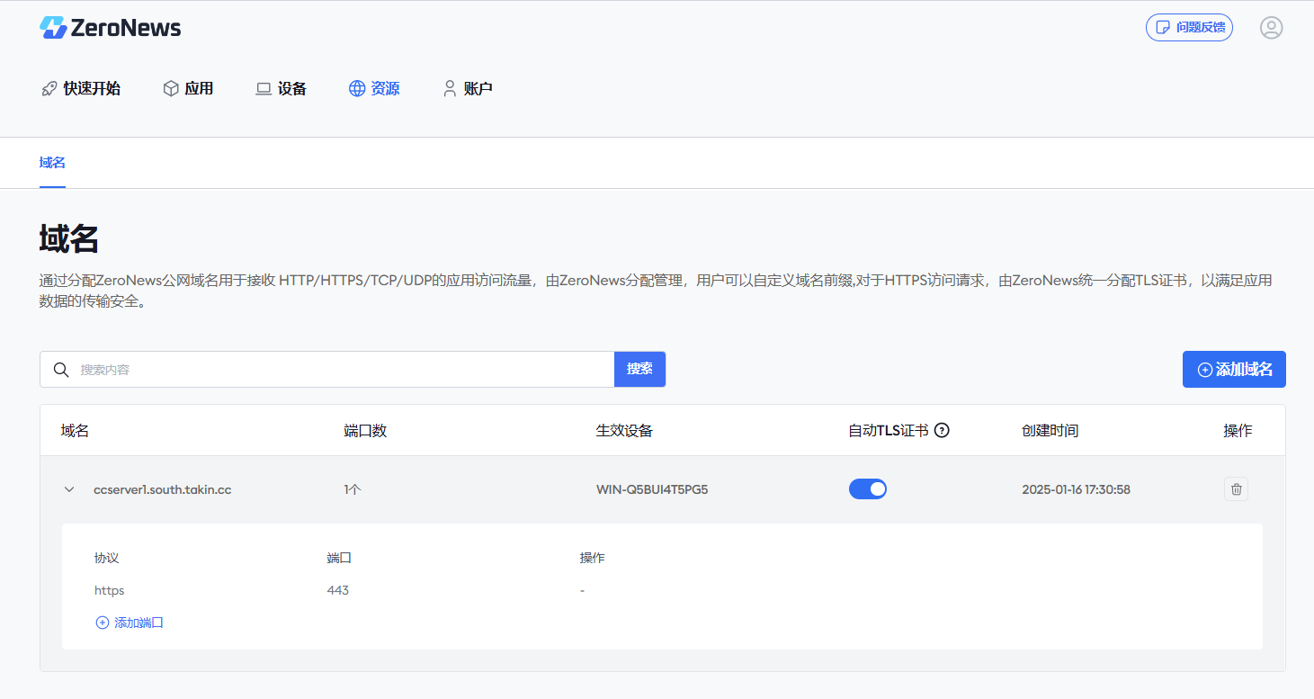 4、 安装好内网穿透工具后,就进入到控制台配置,先添加一个自定义域名,需要容易记住的,然后启用443端口(开启 TLS 证书)