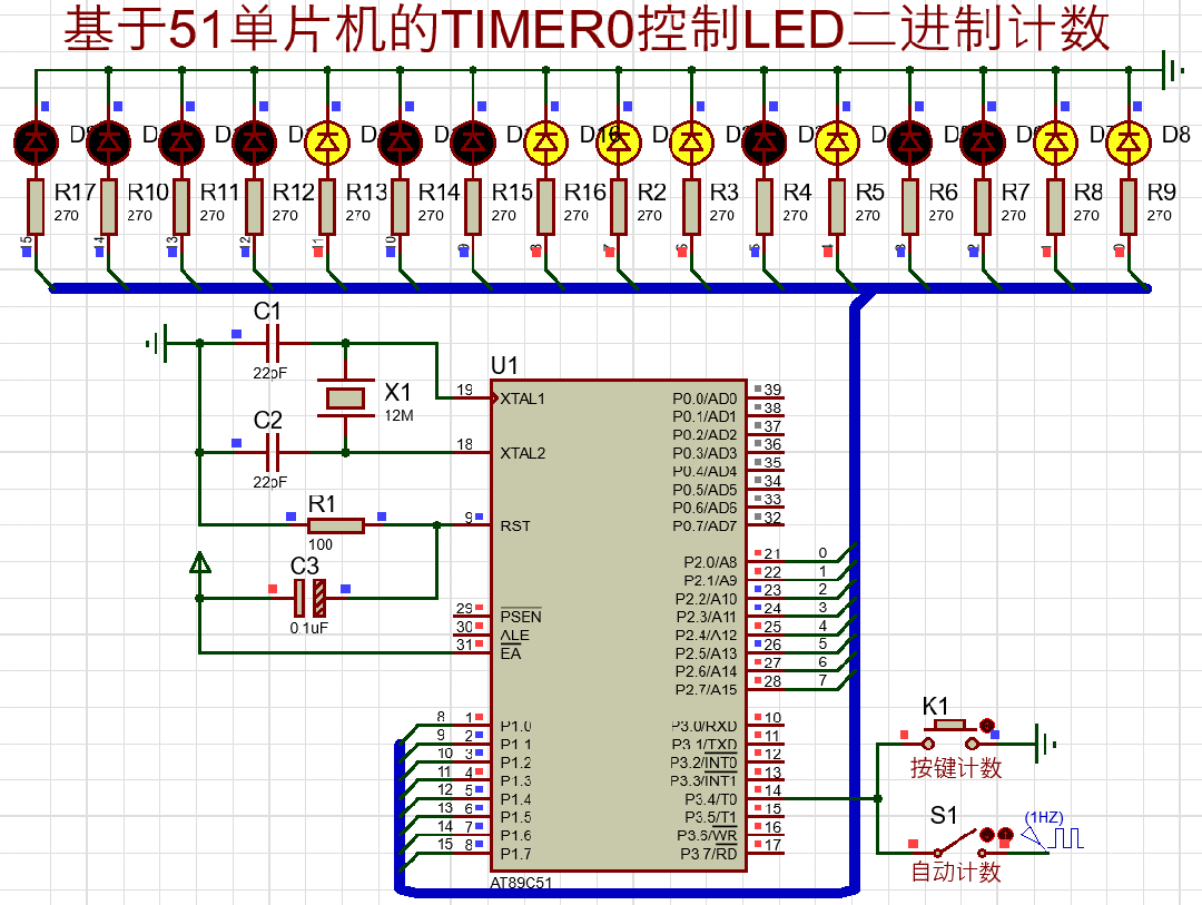 利用51单片机TIMER0控制LED实现二进制计数,通按键手动计数及自动计数。