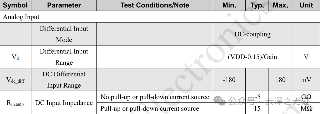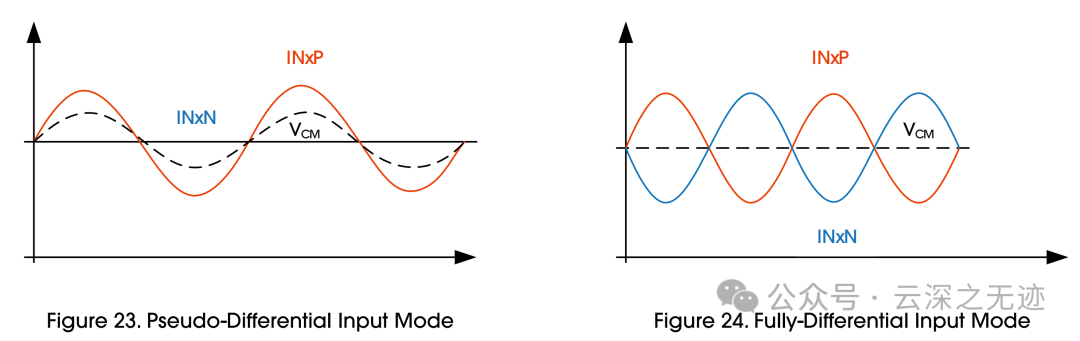 测量两个输入端(INP 和 INN)之间的电压差。INP 和 INN 是两个输入信号,均围绕共模电压 VCM 波动。