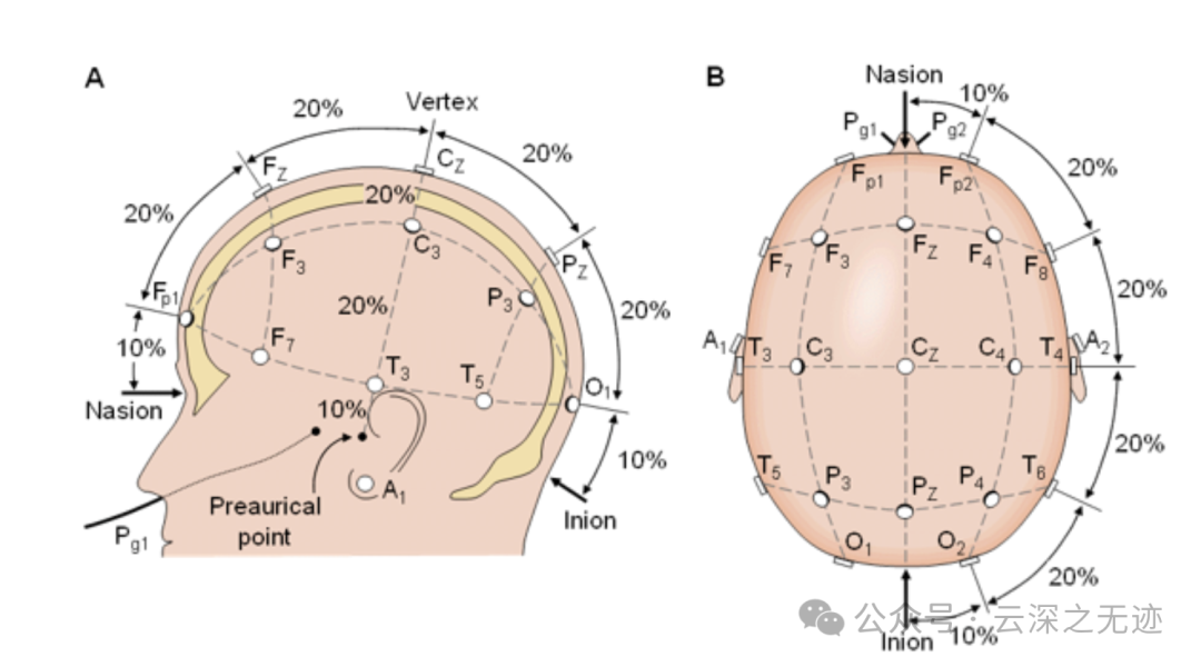 在头皮表面确定两条线,第一条为鼻根(Nasion)至枕外隆凸(Inion)的前后连线,第二条为左右耳前凹之间的左右连线,这两条连线的交点处于头顶处,即为电极Cz的位置;鼻根至枕外隆凸的前后连线的长度设为100%,沿着鼻根至枕外隆凸的前后连线,从鼻根向后距离为10%的位置定为Fpz电极位置,从Fpz向后每隔20%的距离定义一个电极位置,从前向后依次为Fz、Cz、Pz和Oz,其中电极Oz距离枕外隆凸的长度为10%;左右耳前凹之间的左右连线长度同样设为100%,沿着这条左右连线,从左侧耳前凹向右距离为10%的位置定为T3电极位置,从T3向右每隔20%的距离设置一个电极,从左到右依次为C3、Cz、C4和T4,其中T4电极距离右侧耳前凹的长度为10%;电极有特定的字母和数字进行标记,其中: