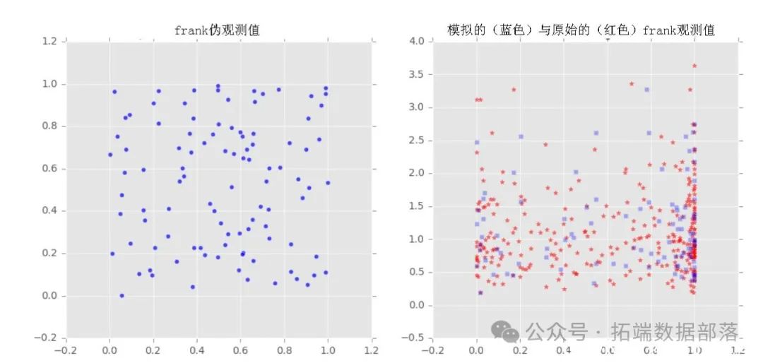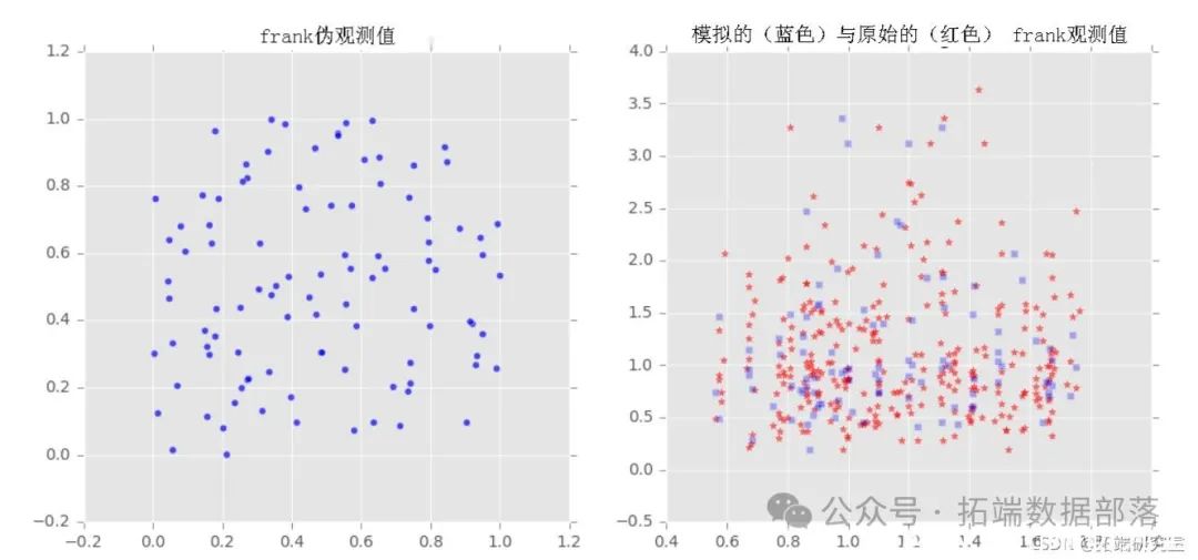 我们对样本x和y拟合了三个族(Frank, Clayton, Gumbel)的copulas,然后从拟合的copulas中提取了一些样本,并将采样输出与原始样本绘制在一起,以观察它们之间的比较。